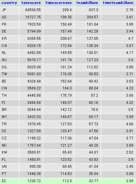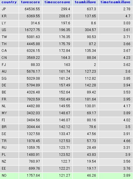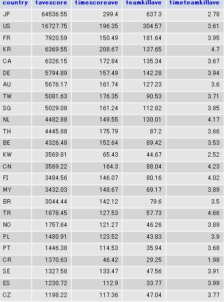 国に寄ってプレイ時間が変わってくるので総合スコアやチームキル数はあまり当てにしないほうがいいです。