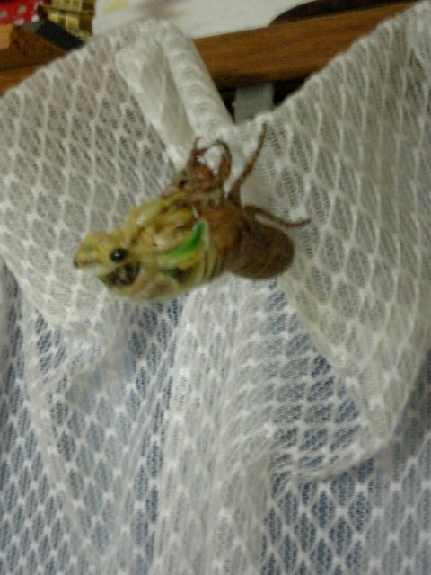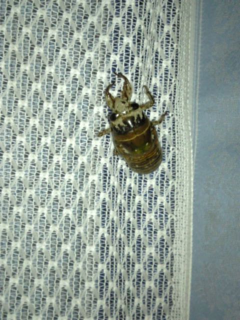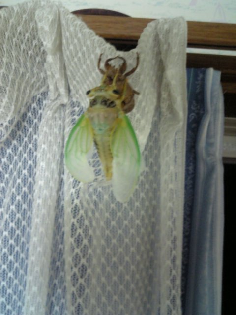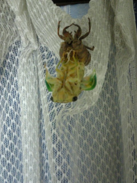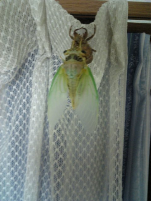 朝起きてカーテンを見ると....あれ?抜け殻だけ.... 本体はどこだーと探してたら網戸にいた。